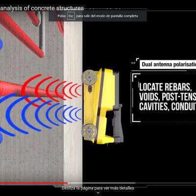Escaner GPR compacto y ligero para análisis de estructuras de concreto. Con controlador externo (opcional) para su uso en ubicaciones de difícil acceso. Interpretación de datos sencilla y rápida gracias al procesamiento de datos en tiempo real con representación de resultados de Realidad Aumentada para una toma de decisiones más eficiente.