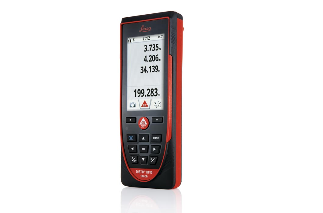 Pantalla táctil grande para un funcionamiento rápido e intuitivo. Por medio de acciones comunes como arrastrar y acercar con dos dedos, es posible acceder rápida y fácilmente al resto de las funciones. También es posible efectuar mediciones por medio de la pantalla táctil, lo cual evita que se mueva accidentalmente el medidor laser Leica DISTO™ D810 durante la medición.