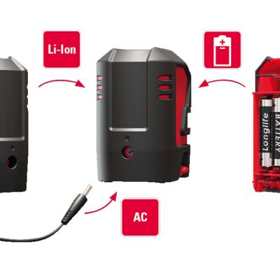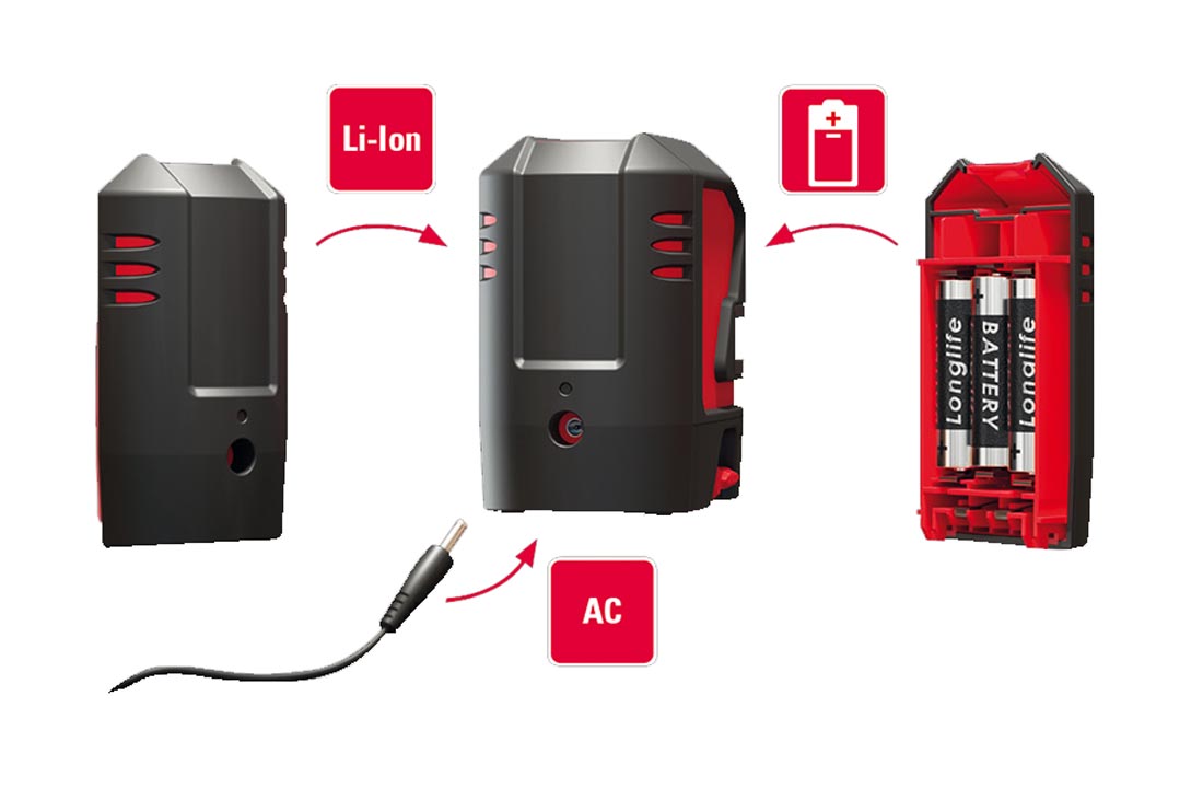 Las baterías Li-Ion permiten que esta herramienta láser integral funcione hasta 28 horas con una sola carga. Alternativamente, puede ser alimentado por pilas Alcalinas o por su cargador.