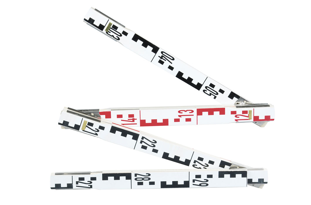 Metros de nivelación de madera lacada o aluminio plegables con graduación combinada en E y en mm con segmentos de 0.5m en varias longitudes disponibles. Bisagras de latón resistentes.