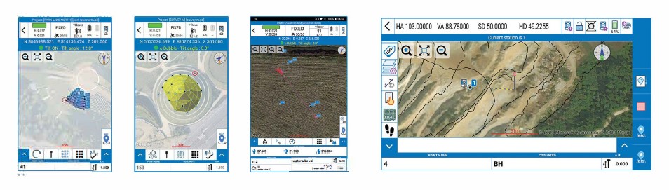 Una interfaz de encuesta simple e intuitiva con numerosos indicadores ayuda inmediatamente al topógrafo a comprender qué tipo de trabajo y en qué condiciones se está llevando a cabo. Los indicadores muestran información variada, como el estado de la solución, la precisión de la posición, los niveles de la batería, los retrasos en la corrección RTK y más. Las pantallas intuitivas permiten cambiar fácilmente la configuración, ver los puntos recopilados, agregar nuevos elementos y dibujos CAD o continuar con la topografía.
