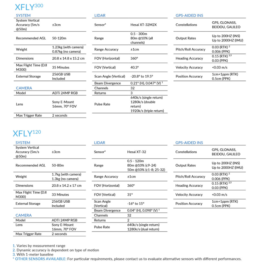 La serie XFLY integra un sistema de navegación inercial de alto rendimiento con cámara y LiDAR para la generación de nubes de puntos. Se pueden satisfacer las diferentes necesidades de los clientes eligiendo el LiDAR Hesai XFLY120, XFLY300 u otros sensores. La plataforma de procesamiento contiene una interfaz Wi-Fi, un módem celular incorporado para correcciones RTCM, software de registro de datos y una red Ethernet gigabit.